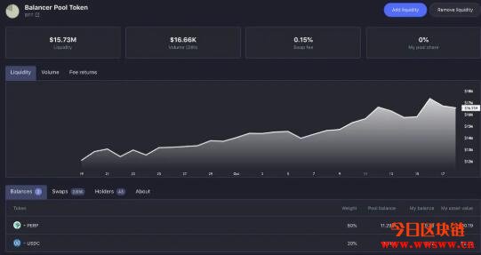 目前**协议团队已经推出LP奖励计划。只要成为平衡器上的流动性提供者,就能获得丰厚的回报。年化收益率达到惊人的172%,以PERP Token的形式派发。因为是分散兑换,每次领取奖励都要支付少量ETH作为加油费。
