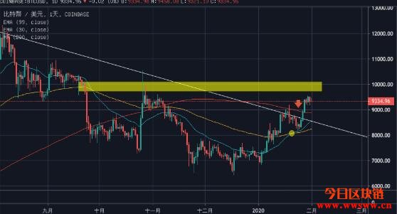 现在比特币已经站上了200日均线,也突破了下降趋势线。未来如果能保持趋势,200日均线逐渐走平甚至上涨,比特币中长期将进入长期趋势。目前上方有2019年9月、10月的下行压力(黄**域),很可能在此盘整,等待突破。
