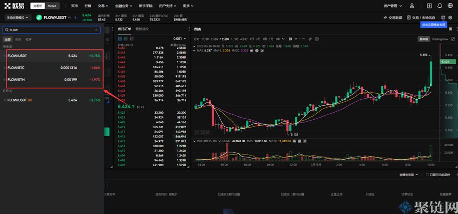 2、在交易对中输入FLOW,就会出现欧意交易所支持的相关交易对