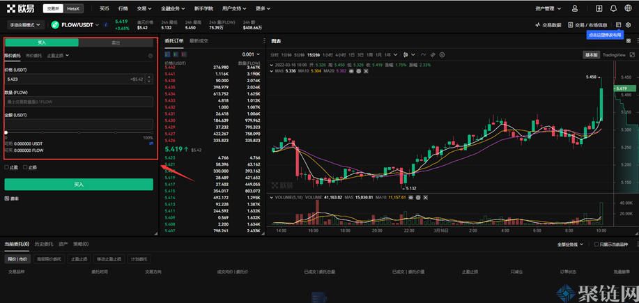 3、点击交易对后会出现交易界面,根据需求购买和交易FLOW币