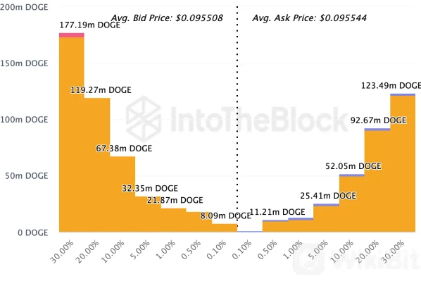 尽管狗狗币的反弹力度不如加密市场上的其他一些山寨币,但它仍然受到散户投资者的青睐。 这些散户投资者一直在公开市场上发出大量买单,这成功地掩盖了过去几天的抛售压力。有趣的是,狗狗币买家正在成为模因币的主导者。 **交易平台的订单簿数据证明了这种主导地位的转变,这些数据显示与卖家相比,购买墙非常大。IntoTheBlock 在其 Exchange-Onchain 市场深度页面上显示,狗狗币的竞标者远多于询问者。 目前卖家的订单量为 318.8 亿 DOGE,平均要价为 0.095544 美元。