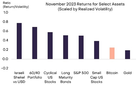 上个月,金融市场似乎对各种尾部风险有所放松,这有助于此前表现不佳的资产反弹。 例如,中东冲突的积极迹象似乎减少了对更广泛的地区混乱的担忧,与以色列经济相关的资产因此出现反弹(图表1)。 同样,在财政部宣布借贷需求增幅小于预期后,长期国债价格上涨(收益率下降)。 消费者价格通胀也继续下降,增加了人们对美联储**降息和美国经济潜在“软着陆”的希望。 经波动率调整后,比特币本月表现不佳(自 8 月底以来表现出色),但仍实现了 9% 的涨幅(以太坊在 11 月上涨了 13%)。