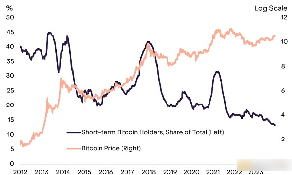 话虽这么说,我们认为金融市场和经济的核心情况可能对比特币和其他加密资产有利。 在潜在投资者流入美国现货 ETF 产品之前,比特币的供应相对“紧张”。 例如,根据 Glassnode 数据,短期投机者持有的比特币供应份额达到历史新低(图表 5)。 同样,灰度研究的分析还表明,很大一部分比特币由可能**出售到升值市场的实体持有(更多详细信息,请参阅揭秘比特币的所有权格局)。 明年的比特币减半也将限制新**供应的增长。 我们认为,缺乏弹性的比特币供应和潜在的新投资者流入的结合应该会对估值产生积极影响。