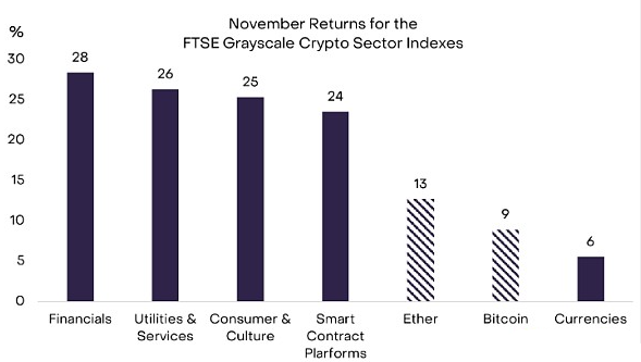 根据富时灰度加密货币行业指数系列,上个月表现**的细分市场是金融加密行业、公用事业和服务加密行业以及消费者和文化加密行业(图表 2)。 Thorchain 的 RUNE **上涨 131%,为金融加密行业指数提供了支撑; 该协议运行去**化交易平台 ThorSwap,该交易平台最近的交易活动有所增加。 对于消费者和文化加密货币领域,11 月份的收益反映了游戏相关** ImmutableX 和 Illvium 的增长。 Illuvium(上涨 119%)于 11 月 28 日在 Epic Games Store 上架其同名游戏,而以太坊上用于加密游戏应用程序的第 2 层区块链 ImmutableX(上涨 87%)宣布与 Ubisoft 建立合作伙伴关系。