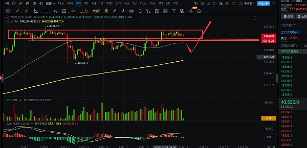 4小时线上看,大饼白盘还是在这个区间震荡,没有跌破,反弹也没有突破震荡区间,短线也能视为压力,由于近比特币现货ETF即将通过,大饼再度拉高,一直居高不下,今天23日,25号是美国的圣诞,圣诞对于整个市场来说属于是利空的,究其原因就是过节,不过这个利空只是暂时的,但我们还是需要考虑进去,晚间大饼依旧是关注下方43100破位,如有效跌破,短线上还是会有一波回调,回调后再去反弹,如不破,依旧是震荡区间43100-44640持续震荡,自行把握进场机会;短线交易,控制风险,盈亏自理;