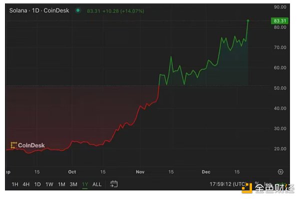 Solana 从 10 月中旬开始大幅上涨,今年以来涨幅已超过 700%。美国证券交易委员会在 6 月份针对加密货币交易所 Coinbase 的投诉中将该与其他加密货币一起命名为“未注册证券”,但此次涨势并未受到影响。