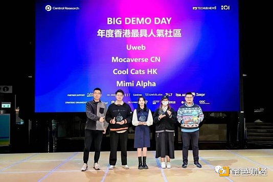 在BIG DEMO DAY的圆桌会议和路演项目结束后,我们迎来了激动人心的颁奖环节。今年,BIG DEMO DAY 香港**人气社区奖分别由Mocaverse CN、Cool Cats HK、Mimi和Alpha夺得。