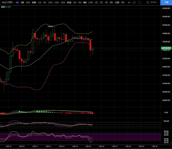 也许是因为周末的关系,也许是因为圣诞节的缘故,交投量大幅缩水,导致整个市场清淡很多,波动更是保持在一个极小的范围内运行,周六日也休息,昨日晚间走势触及44000附近承压回落,以**的振荡下行强势扭转了局面,终在早间爆发,瞬间插针千点空间,同时昨日晚间我也提醒过日线级别没有**上破,依然要关注下方的支撑!咱们看看今日盘面走势