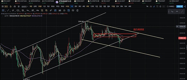 ETH近期走势主打一个反复,多空的反复。从小时图可以看出ETH主要支撑还是在2100毕竟好不容易来到了2000大关,一时间这里的支撑还是很强劲的,当价格触及到2100之后还是反弹的比较**,只是在通道内还是来回的洗盘,无论多头还是空头想吃一个方向还是比较难的。进场位置不好的话还是很容易被洗出局。