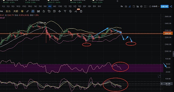 极短周期4小时走势也同样预示了空头走势加强的信号,当前K线走势处在前期顶部支撑2240上方,盘中有触及此处反弹。但RSI指标趋势线跌破中轴50去向空头25值附近,KDJ同样下穿后加大下行开口角度。整个走势指向仍有震荡下行空间,盘中关注2240-2230区间能否在回踩后起到支撑。 支撑失效则下方2170有直接回落接触风险。