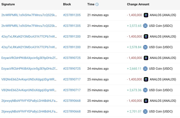 首先,他以12枚SOL(约合900美元)购入26亿枚Analos**。接着,他在市场上以143万USDC美元稳定币的价格,成功卖出其中的14.5亿枚Analos。