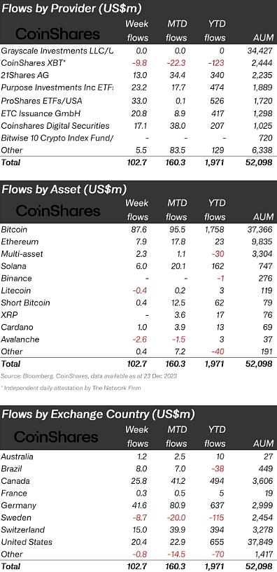 根据CoinShares每周报告,截至12月22日当周,华尔街加密基金的资金回流达1.03亿美元。而从各个币种的流入量上可以看到,Solana紧追在比特币和以太币身后。再者,若是你回推前13周的流入量,可以发现传统机构似乎正在持续做多Solana。