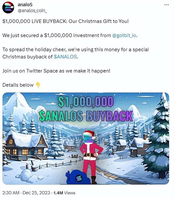 周一,Analos宣布已从知名对冲基金Gotbit Hedge Fund获得100万美元的重要投资。这笔资金将用于启动一项大规模的**回购计划,回购后的所有Analos将被分配至其金库中。团队表示,这些**将用于未来的多项活动,包括上架新交易所、市场营销活动、空投等,以推动整体项目的发展。