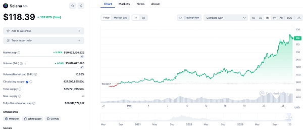 截至周二亚市,SOL价格从120美元高价微幅回落,报在118.39美元,单月录得102.67%涨幅。