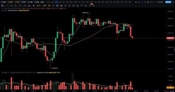 四小时整体来看是属于上涨趋势之后的回调,因为上方的压力很重,所以需要回调蓄力,同时把做多的人赶下车。下方也是密集成交区形成的压力位,目前来看,BTC短期的走势震荡的概率比较大,大幅下跌的可能性很小。