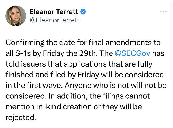 “我们确认29日(周五)为对所有S-1申请进行**修订的日期。@SECGov已告知发行人,在周五之前完成并提交的申请将在**波中得到考虑,否则将不予考虑。此外,申报文件不得提及实物赎回,否则将被拒绝。”