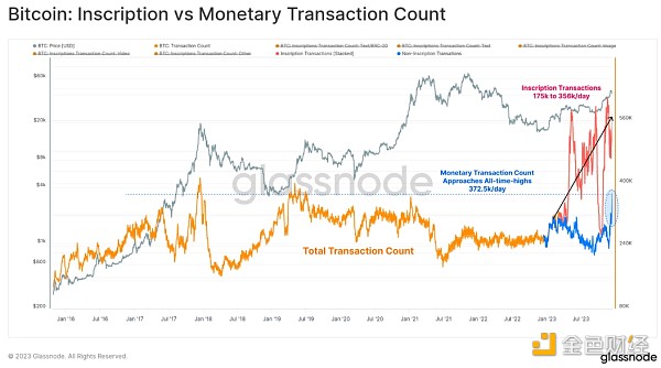 铭文交易在经典货币交易的基础上每天额外增加 175,000 至 356,000 笔交易。(红色)
