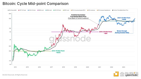 技术市场中点:作为熊市早期的支撑位和熊市后期的阻力位的广泛价格水平。 在本周期中,3 万美元是一系列投降性抛售之前的一个主要支撑区域,导致 FTX 崩溃。