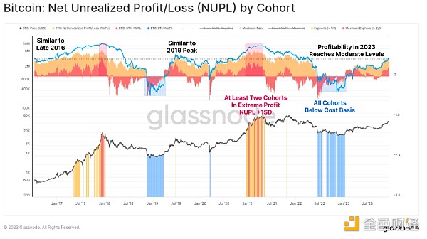 关于投资者盈利能力的话题,2023 年将长期持有者、短期持有者和普通持有者从无利可图转变为适度盈利的状态。 每个队列的 NUPL 指标尚未达到令人兴奋的高点,但也明显高于各自队列的收支平衡水平。