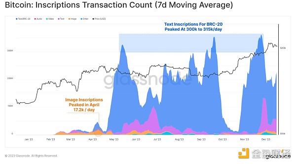 绝大多数铭文往往是基于文本的,并且与称为 BRC-20 (蓝色) 的新颖标准相关。 在高峰期,比特币网络每天的铭文数量超过 30 万,远远超过了 4 月份基于图像的铭文 ? (红色)每天 17.2 万的峰值(图像更大,因此随着费用的增加,铭文成本更高)。