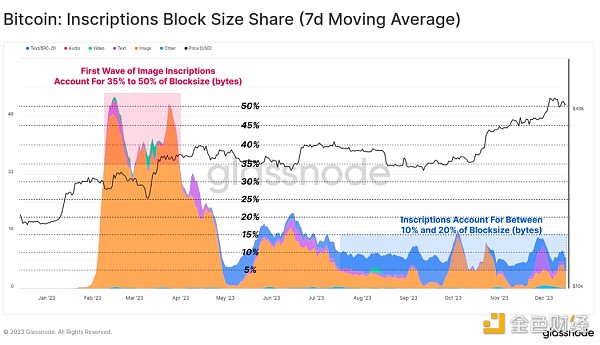 有趣的是,虽然铭文约占已确认交易的 50%,但令人惊讶的是,它们仅占用区块空间的 10% 至 15% 左右。 这是文本文件较小以及与 SegWit 数据折扣(我们在 WoC-39 中介绍的主题)相关的细微差别的结果。