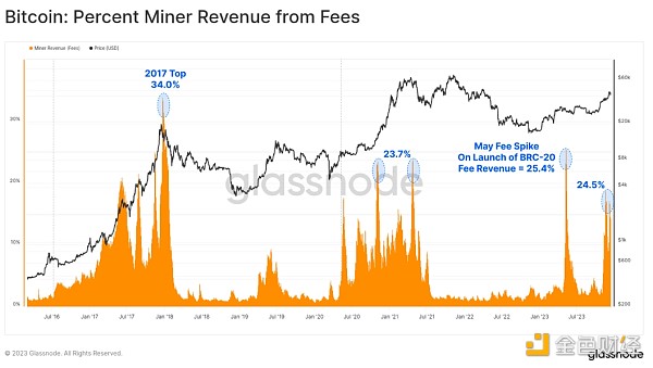 由于比特币区块空间的这个新买家,矿工的费用收入大幅增加,2023 年有几个区块支付的费用甚至超过了 6.25 BTC 的补贴。 今年出现了两次费用大幅上涨,目前费用约占矿工收入的四分之一。 这与 2017 年和 2021 年牛市的欣快阶段相当。