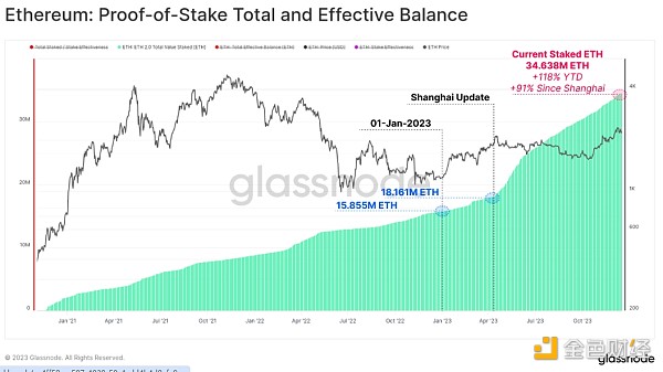 以太坊的另一个关键增长领域是通过新的权益证明共识机制质押的 ETH 总量。 今年以来,质押 ETH 的数量增长了 119%,目前锁定在质押协议中的 ETH 数量已超过 3463.8 万枚。 上海升级也在 4 月份成功推出,自 2020 年 12 月 Beacon 链推出以来,允许质押者完成提现,并重新洗牌质押提供商和设置。