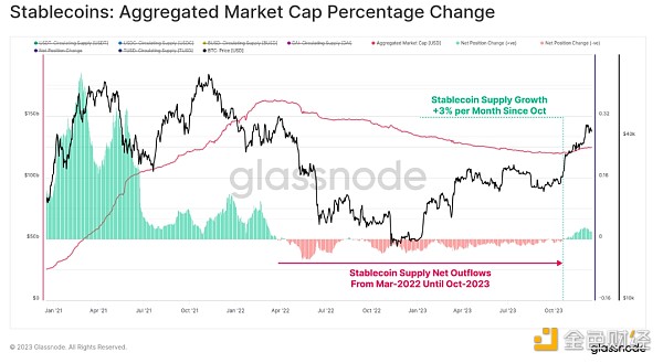 然而,10 月是一个关键点,稳定币总供应量触底于 1200亿美元,供应量开始以每月高达 3% 的速度增长。 这是自 2022 年 3 月以来稳定币供应量的扩张,也可能是投资者兴趣回归的迹象。