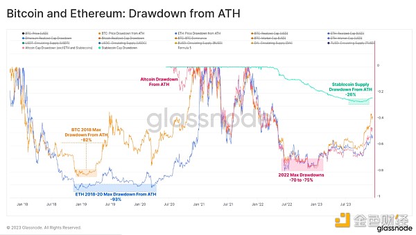 2022 年熊市的残酷程度略低于 2018-20 年熊市周期,大多数主要数字资产从 2023 年开始均较 ATH 下跌 -75%。 自低点以来的强劲表现弥补了大部分损失。 主要资产目前落后于其 ATH -40%(BTC)、-55%(ETH)、-51%(山寨币,不包括 ETH 和稳定币)和稳定币供应量(-24%)。