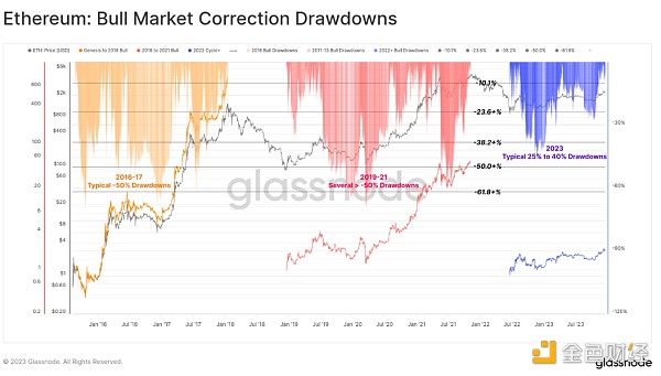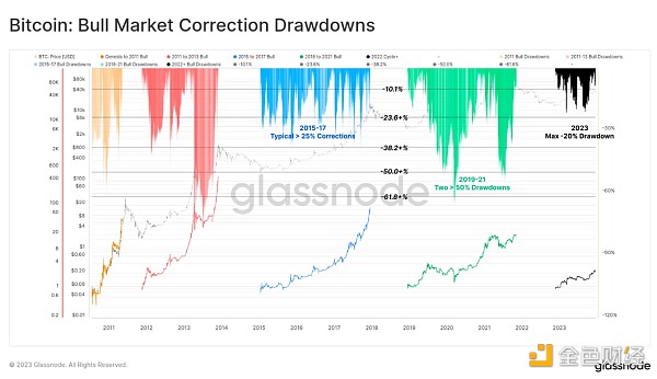 2023 年市场的显著特征之一是所有价格回调和调整的深度都非常浅。 从历史上看,BTC 的熊市复苏和牛市上升趋势期间通常会从局部高点回调至少 -25%,许多例子超过 -50%。