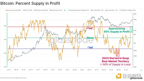 另一方面是,“盈利”供应量目前占流通供应量的 90% 以上,10 月份的反弹使其高于历史平均水平。 鉴于 2023 年伊始超过 50% 的供应量处于水下状态,这是历史上最快的复苏之一(仅次于 2019 年的反弹)。