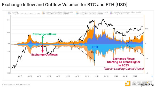 我们还可以看到,全年 BTC 和 ETH 的交易所流入和流出量有所增加,表明现货交易兴趣普遍扩大。 值得注意的是,BTC 交易量的增长速度明显快于 ETH 交易量,这与比特币主导地位不断上升的观察结果一致。 在长期熊市之后,比特币带领投资者信心走出低迷是很常见的,这张图表有助于直观地展示这一现象。