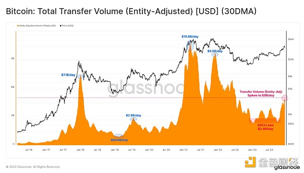 我们可以看到,在10月份之前,比特币的交易量相对停滞不前,这支持了市场阶段转变的观点。10月份的反弹推动比特币的交易量从每天24亿美元翻了一番,达到每天50多亿美元,这是自2022年6月以来的水平。