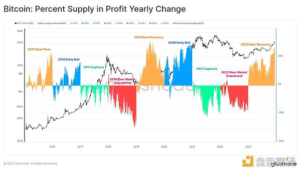 下图直观地展示了自 2015 年以来每个日历年的利润供应百分比变化。虽然按年份划分并不,但经典的四年比特币周期使我们能够发现一些有趣的模式: