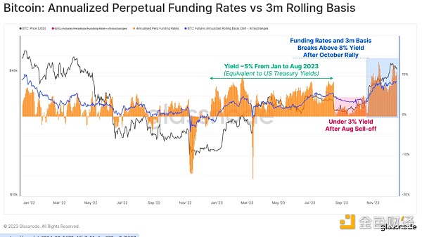 十月起,收益率突破 8%。 由于期货基差目前维持在高于美国国债 300 个基点的水平,做市商资本现在有动力重返数字资产领域。