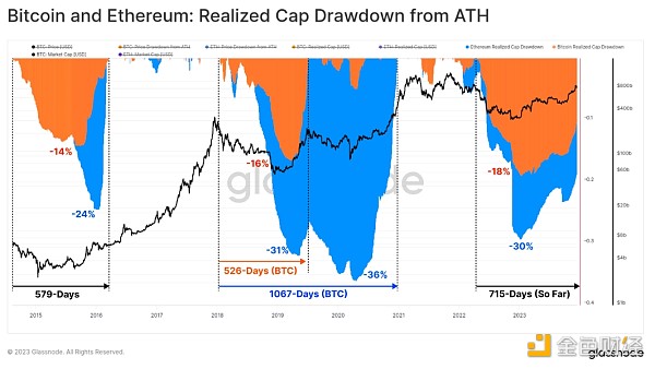从链上角度来看,BTC 和 ETH 的已实现上限提供了一个出色的工具来跟踪各自资产的资本流动恢复情况。 2022 年熊市期间的总已实现上限下降达到了与之前周期相似的水平,反映出 BTC 的净资本流出为 -18%,ETH 的净资本流出为 -30%。