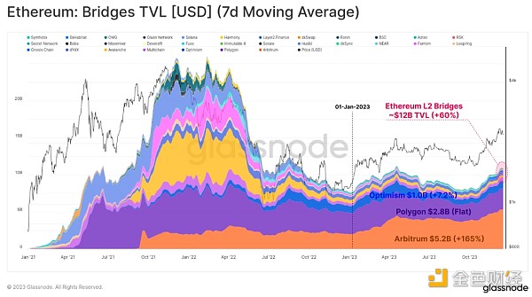 虽然 ETH 的市场价格总体表现落后于更广泛的数字资产领域,但其生态系统仍在不断扩大、成熟和发展。 特别是,锁定在不断扩大的 Layer-2 区块链中的总价值增加了 60%,其中超过 120亿美元现在锁定在桥中。