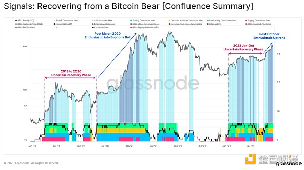 我们还可以看到从比特币熊市信号中恢复的特征发生了显著变化,因为自 10 月份以来所有八个指标都进入了正值区域。 2023 年的大部分时间里,读数参差不齐,表现出与 2019-20 年期间非常相似的特征。