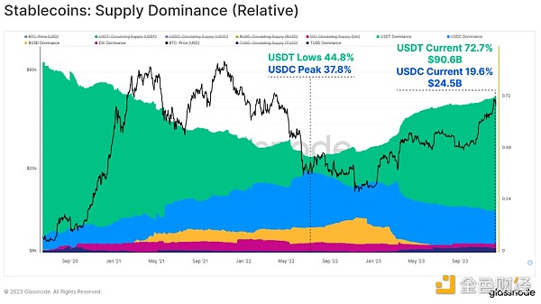 各种稳定币之间的相对主导地位在2022年至2023年间也发生了显著变化。此前上涨的稳定币如USDC和BUSD的主导地位已大幅萎缩,BUSD进入赎回模式,而USDC的主导地位自2022年6月以来从37.8%下降至19.6% 。
