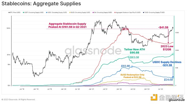 自 2022 年 3 月以来,稳定币总供应量一直在下降,较峰值下降了26%,成为市场流动性的主要阻力。 这是由于监管压力(SEC 指控 BUSD 为证券)、资本轮换(更喜欢美国国债而不是无息稳定币)以及投资者对熊市的兴趣减弱等综合因素造成的。