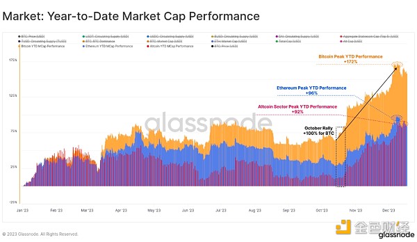 2023 年对于数字资产来说是不平凡的一年,比特币的市值增长了 172% 的峰值。 数字资产生态系统的其他部分也经历了强劲的一年,以太坊和更广泛的山寨币领域的市值增长了 90% 以上。
