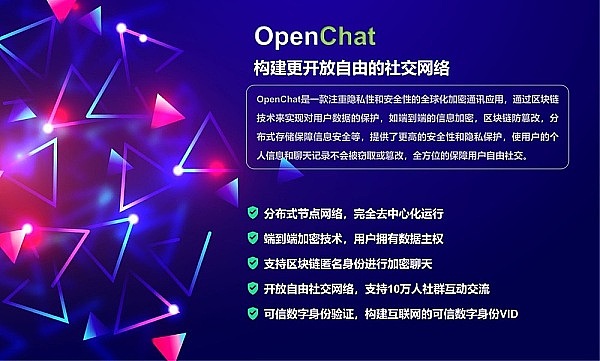 OpenChat的成立标志着数字经济和数字社会的一个新起点。OpenChat利用区块链、加密通讯等技术,突破传统社会化平台的数据垄断,构建公平、透明的数据分享机制,为数字经济的交流与交易提供安全、可信的环境。