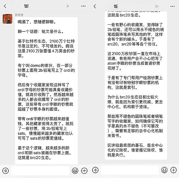 什么是铭文?通俗理解就是在比特币**单位聪sat上铭刻信息,比如写入ordi、sats等文本,这些文本就是brc20,也有铭刻图片的,就是比特币NFT。