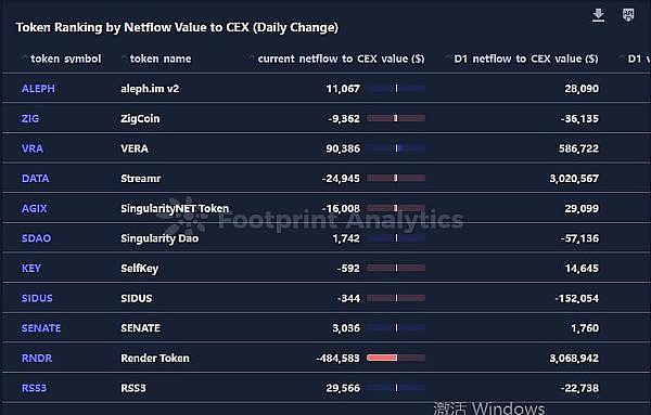 CEX 净流量价值排名的**(每日变化):通过 CEX 的净流量价值来分析**排名的每日变化,可以为投资者对 AI 和大数据领域**的兴趣和信心提供有价值的见解。排名上升最显著的**反映了投资者情绪的高涨和资本流入的增加,因此在剖析其驱动因素时值得关注。相反,排名大幅下降的**则表明投资者资金外流,需要仔细检查持续时间和程度,以确定是否存在系统性风险。