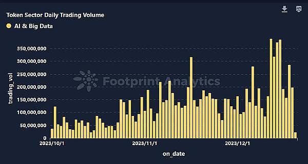 行业每日**交易量:通过追踪 AI 和大数据领域**的每日交易量,从 10 月到 12 月,我们观察到日均交易量呈显著上升趋势,并在 12 月中下旬达到 389,149,331 美元的峰值。这种激增反映了市场对 AI 和大数据领域的持续关注和资本输入,突显了该领域在加密货币市场中的重要性。