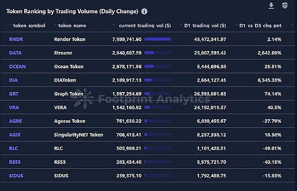 该领域**交易量排名(每日变化):通过 AI 和大数据领域内的交易量分析 Token 排名的每日变化,可以表明投资者对 AI 和大数据区块链领域内特定项目或技术不断变化的情绪和兴趣。