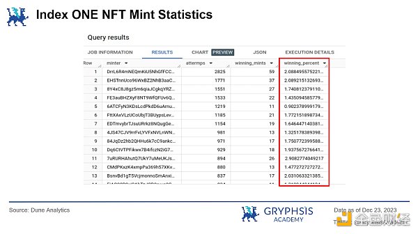 得益于 Solana 的高吞吐量和出块速度,利用区块哈希值作为随机数字生成器,并在每个区块中选取一个胜者的方式为我们带来了令人兴奋的公平性。然而,这并非没有隐患。在 Index ONE NFT 的铸造中,我们看到 Solana 链上的交易量达到了每分钟平均约 7000 笔,大约 120 TPS,而这仅仅源于这一个铸造事件。