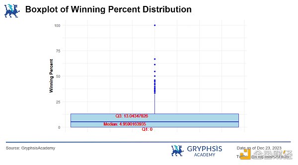 从该箱型图中,我们也能够进一步看出参与者胜率的分布情况,其中第三四分位数(Q3)的数字约为 13.04% ,表明有 75% 的参与者的胜率都低于该数字。结合前面的散点图,我们不难发现这另外 25% 的参与者均为那些参与次数较少的“幸运儿”,这在**机制中属于非常正常的现象,并没有对我们预期的公平分配结果造成影响。
