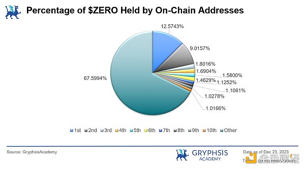 根据 Solscan 数据显示,目前链上持有 1% 以上 $ZERO 的地址共有 10 个,总 32.4% ,其余地址持币占比 67.6% 。其中,开发者 Pland 作为第四大持币地址共持有 1.69% 的**。
