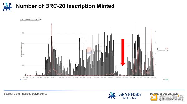恰逢此时,Solana 生态系统经历了令人印象深刻的反弹,在多元化的创新项目和强大生态系统的推动下,Solana 将再次成为牛市中**门的竞争者,尤其是其高吞吐量和低延迟交易的特性对于铭文和 NFT 市场至关重要。截止 2023 年 12 月 17 日,Solana 链上的铭文总数已超过 100 万。